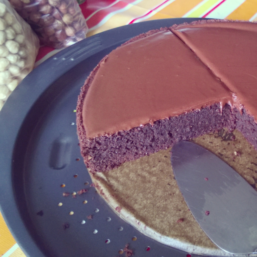Но сега сериозно. Много вкусно, лешниково-шоколадово сладкишче с шоколадово-лешников ганаш за глазура. Сладко, сочно и малко тежко – няма как, не съдържа брашно, но пък доволно количество лешници, масло и яйца. Рецептата е вдъхновена от домашния гараш на моята баба Вихронрав, която за рождения си ден просто ни съсипа от гастрономически кеф!
