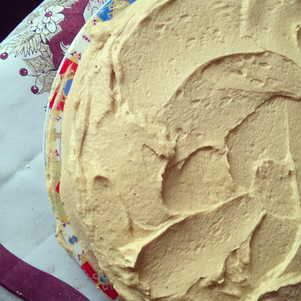 – Горният блат се намазва с крема от карамелизиран бял шоколад и крем-сирене. Тъй като всичко се случва в ринг за торта, горният блат се покрива най-много с толкова крем, колкото стига да се запълни рингът до горния ръб.