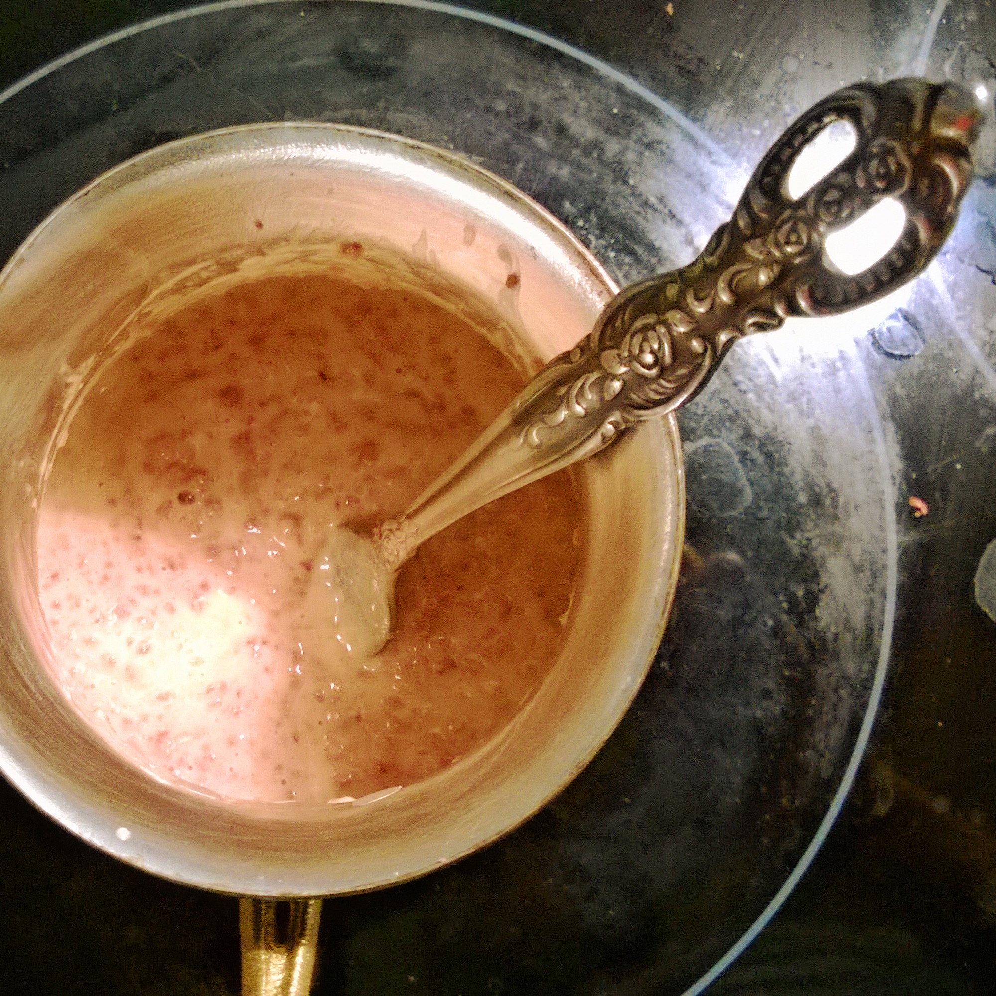 – След около 5 минути борба, можем да прелеем редукцията в друг съд (вероятно ще е около 1-1.5чч като количество), да добавим сладкото и да разбъркаме, и да я оставим да се охлади хубаво.