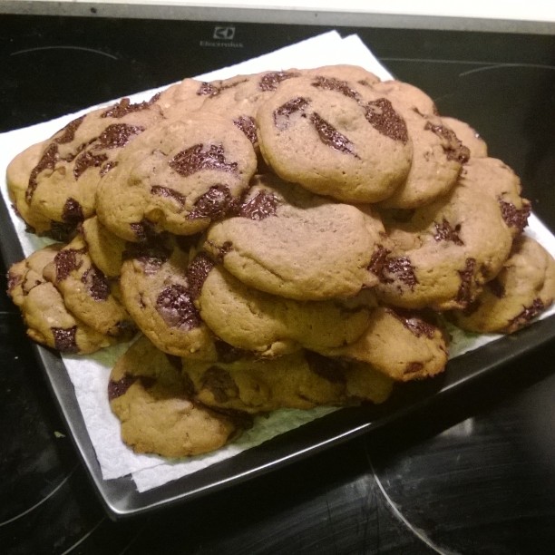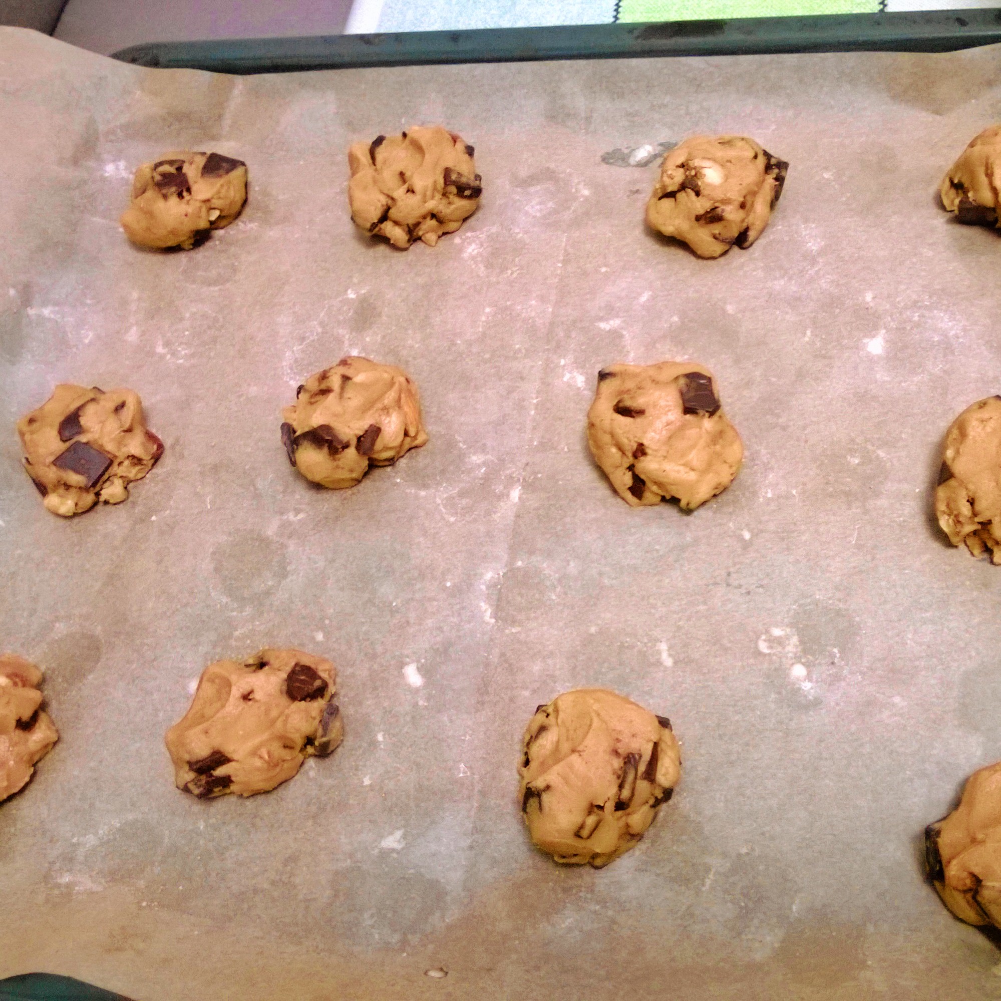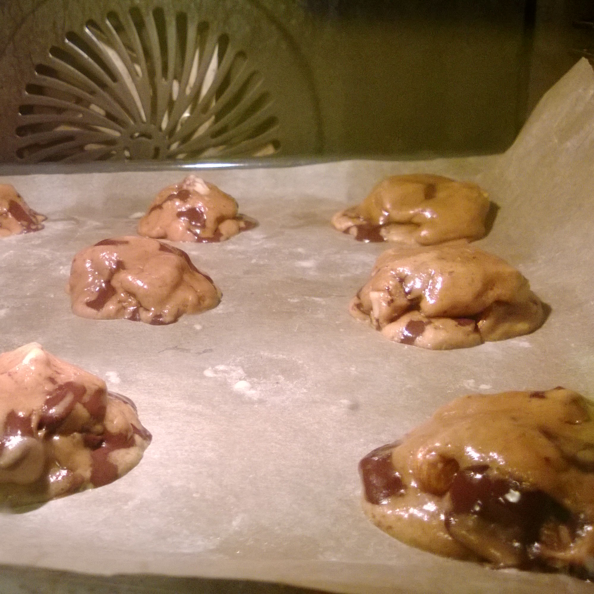 – Натроших наситно 3 шоколада. Покрих тавата с хартия за печене, разпределих равномерно шоколада и го сложих на нивото над средното във фурната, на около 130С.
