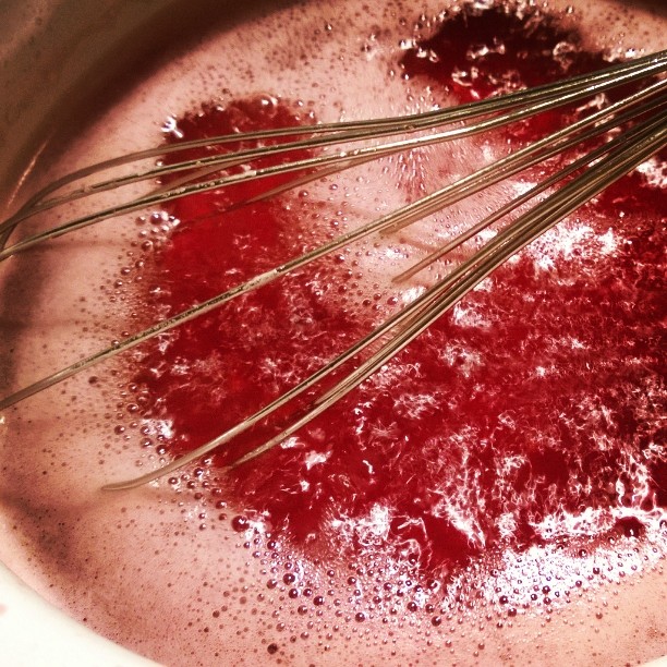 – Сипваме малиновото вино – 3 пъти колкото захарта. Внимание, ще има много пáра! След което изчакваме малко да се разтвори карамелът във виното и си бъркаме с телта.