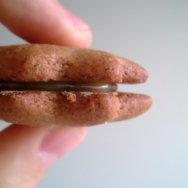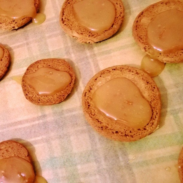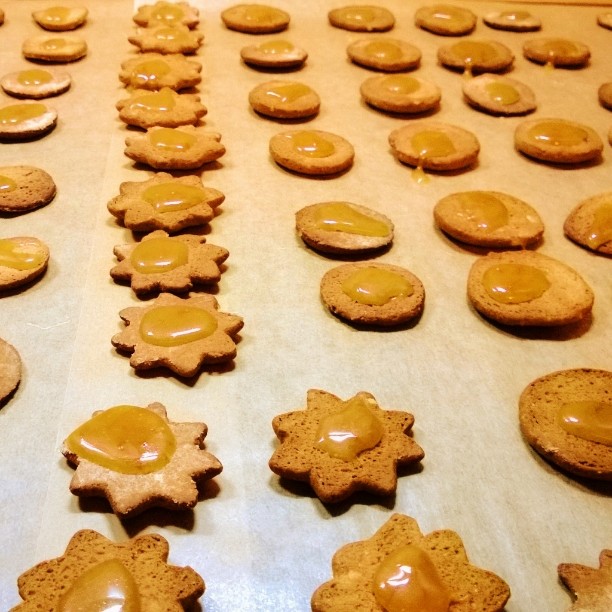 Когато карамелът вече е по-гъст от мед, можете да подредите курабийките с долната страна нагоре (поне аз прецених, че така е по-смислено) и да им капнете по малко от портокаловото тофи. След което ги оставете поне няколко часа, или до следващия ден. Просто нямате представа колко по-вкусни стават, след като са престояли! А на другия ден можете да ги слепите 2 по 2 – стига да не е лято (т.е. температурите да са твърде високи), карамелът стяга до перфектната консистенция. Но наистина не мисля, че това са удачни бисквити за лятото.