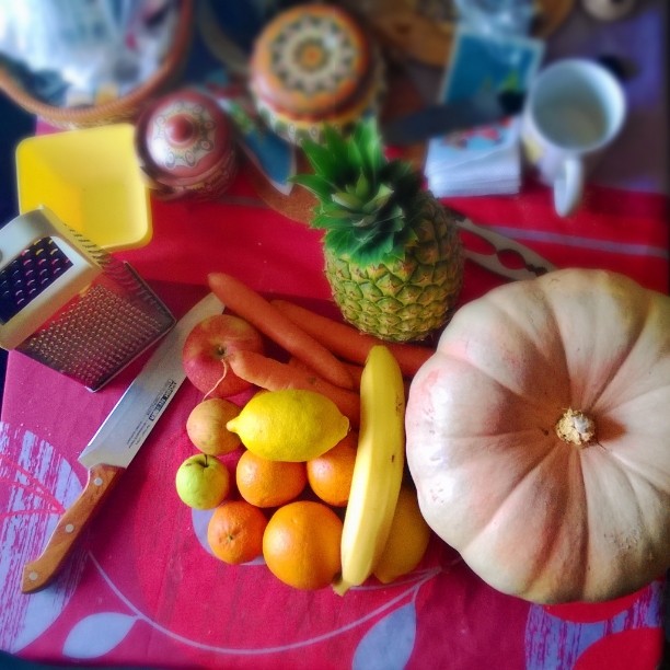 – Добавяте сока от портокала и разбивате бучките, така че да се получи колкото се може по-хомогенна смес.