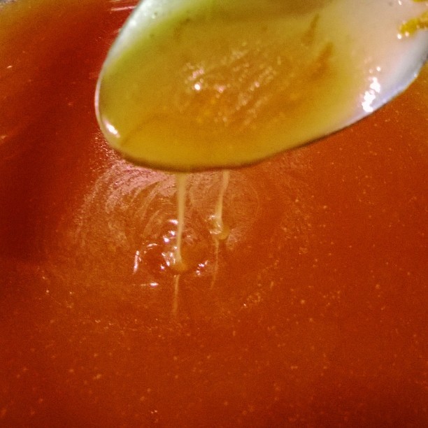 – Когато сместа добие карамелен аромат и тъмнокехлибарен цвят, добавяте маслото с портокаловите кори и разбърквате хубаво. Махате от огъян.