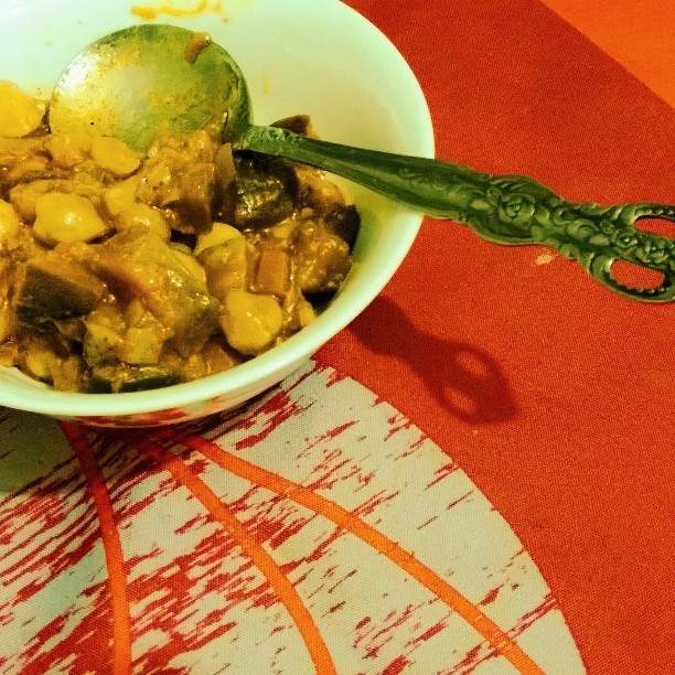 Вкратце, накиснатият нахут се ползва за да се спретне една обикновена супичка, а след това половината нахут от супичката се турга в манджа с патладжани и канела.