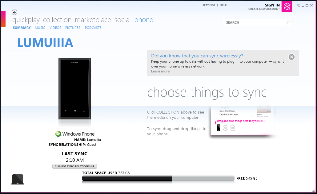 Фактът, че телефонът не може просто да се върже към кой да е компютър и файловете да се изсипват в него като в обикновена флашка донякъде е недостатък, но явно това е принципът на затворените екосистеми (каквато е WP7, както и iOS). Ако съдя по опита ми с iPhone от преди време, това не би ми представлявало голям проблем.