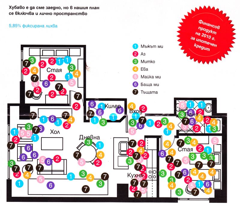 Всички си висят из хола доволно, като тъстът и тъщата (5 и 6) явно по цял ден узурпират двете удобни кресла вляво, а по някаква причина свекървата (7) обикаля нервно зад тях.